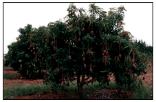 Mango trees produce pink flowers that are pollinated by insects, wind, or hand. We mature and hang down on long stalks and are ready to pick when we change colour and give off a mango aroma. Our parent trees start bearing fruit between 3 and 5 years of age. The fruit can be eaten fresh or processed.